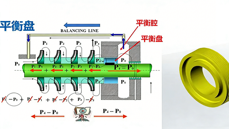 平衡盘就是利用它的两边气体压力差来平衡轴向力的零件。它位于高压端,它的一侧压力可以认为是末级叶轮轮盘侧的间隙中的气体压力(高压)。另一侧通向大气或进气管,它的压力是大气压或进气压力(低压)。由于平衡盘也是用热套法套在主轴上。上述两侧压力差就使转子受到一个与轴向力反向的力。其大小决定于平衡盘的受力面积。通常平衡鼓只平衡一部分轴向力。剩余的轴向力由止推盘(止推轴承)承受。平衡盘的外缘安装气封,可以减少气体泄漏。